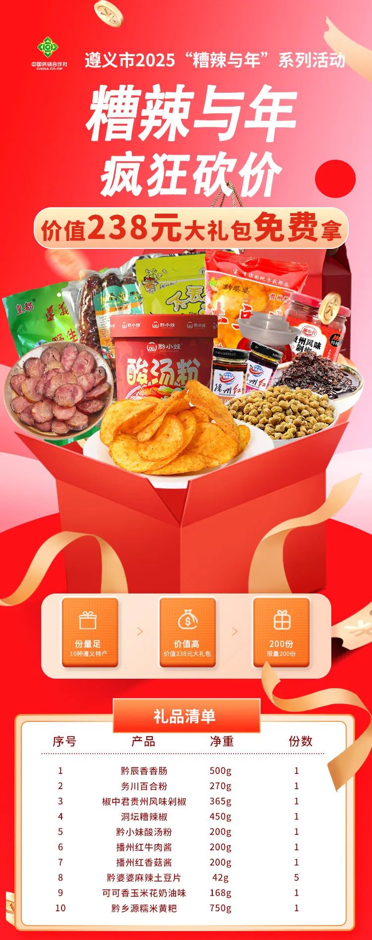 在活動期間, 通過微信朋友圈平臺轉(zhuǎn)發(fā)砍價活動信息,邀請親友幫助砍價??硟r到1.18元即可免費領(lǐng)取“糟辣與年”大禮包一份,合計200份大禮包,等你來領(lǐng)。